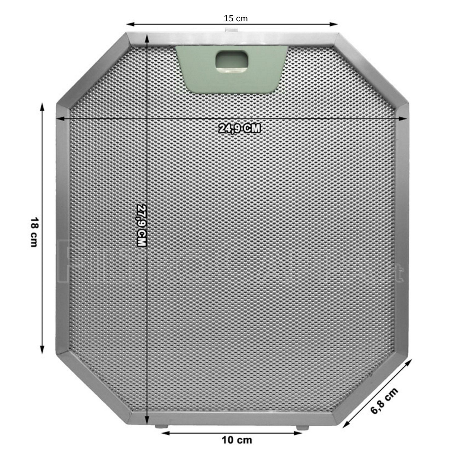 Filtre à graisse autoportant en aluminium, de forme octogonale, dimensions 24,9 x 27,9 cm. Conçu pour assurer une rétention efficace des graisses et des particules générées pendant la cuisson, contribuant ainsi à protéger le moteur et à maintenir les performances d'aspiration de la hotte.
