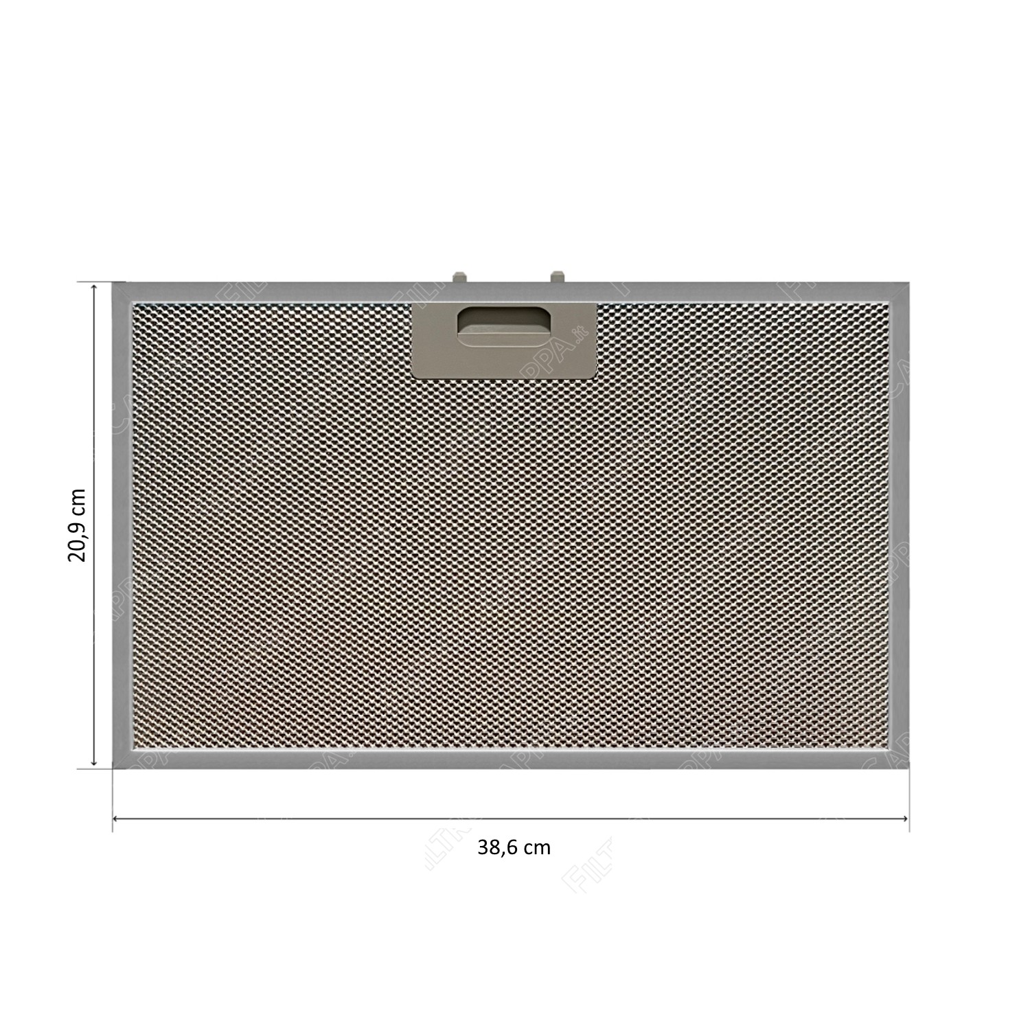 Filtro metallico antigrasso autoportante in alluminio con dimensioni 38,6 x 20,9 cm, progettato per garantire un’elevata capacità di trattenuta dei grassi e delle particelle generate durante la cottura.